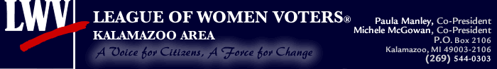 While the issues may have changed, we again produced a Voter Guide to provide voters with “intelligent knowledge” of candidates and ballot proposals in the November election, and distributed 24,000 copies to more than 200 locations throughout Kalamazoo County and an online version available three weeks and a day before the election. Like the primary Guide, this was a collaborative effort with the LWV of Michigan. The State League collected responses from all but the County Commission so they could post Guides for the entire state on the LWVMI website. The Guide was already delivered to many sites when Robert Jones died, so we and LWVMI posted notices on our websites regarding new absentee ballots and provided information about Bobby Hopewell, as the new State Senate candidate.
